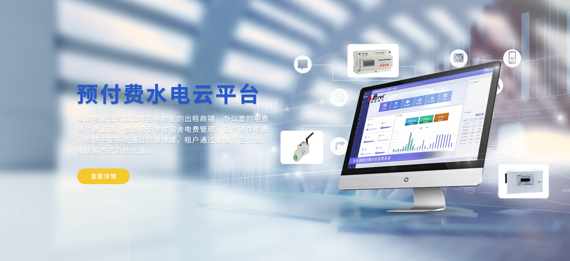 安科瑞提供的解決方案包括Acrel-EIoT能源物聯網云平臺變電所運維云平臺安全用電管理云平臺、環保用電監管云平臺、智慧消防云平臺能源管理云平臺、工業企業能源管控平臺、遠程預付費云平臺、餐飲油煙監管云平臺、電動汽車/電瓶車充電樁收費管理云平臺、電力監控/無線測溫系統、電能質量治理系統、電氣火災監控系統、消防設備電源監控系統防火門監控系統、應急照明和疏散指示系統、智能照明控制系統、醫用隔離電源絕緣監測系統等,幫助用戶實現能源智能化、可視化、精細化管理,提高用能效率和用能安全,為企業節能降耗和實現能源數字化建設提供數據服務。